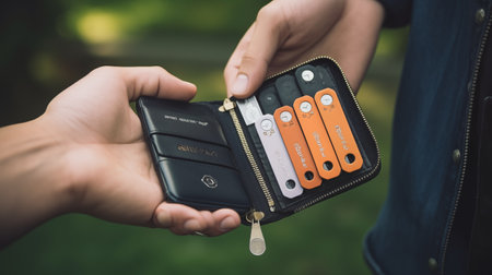 Close-up of a man's hand holding a wallet with credit cards