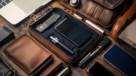 Charging devices in a tech pouch on desk, organized travel digital lifestyle gear setup with neutral background