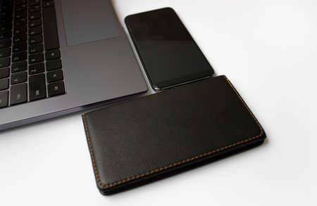 laptop notepad and smartphone lie on a white background. Top view, flat lay. Copy space.