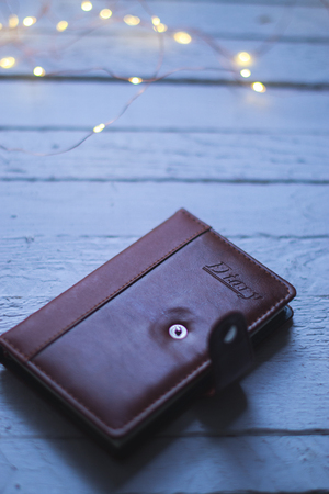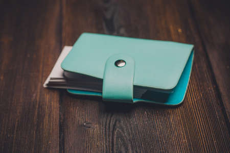 blue wallet on a wooden table business cards coin pocket