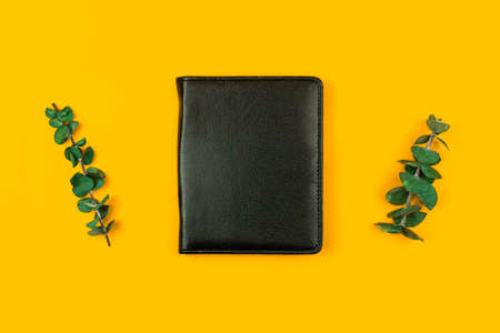 Black leather notebook mockup with dried flowers, office desktop and workspace concept, yellow background, flat lay and top view photo