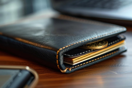 Black leather wallet is laying on a table holding a gold cryptocurrency coin and several credit cards