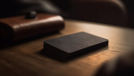 A close-up shot of a stack of black business cards on a wooden table, creating a professional and minimalist mockup for branding and design purposes.