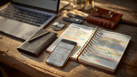 A cozy modern workspace featuring a laptop, smartphone, and planner placed on a rustic wooden table, showcasing a blend of digital and traditional office tools.