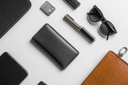 This flat lay showcases a sleek black leather wallet, sunglasses, a smartphone, and a pen, arranged in a minimalist style. Perfect for lifestyle and fashion themes.
