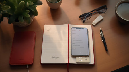 phone with black textured notebook on a white background. View from above.