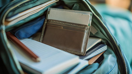 A close-up view of an empty wallet inside a backpack, with books and notebooks around it, illustrating a student's financial situation and budgeting efforts.