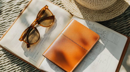 A beautiful flat lay featuring a stylish leather wallet and sunglasses placed on an open book. Perfect for capturing a moment of relaxation in nature.