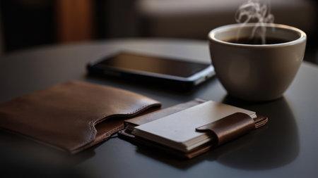 A coffee cup with steam, smartphone, and leather card holders on a dark reflective surface with soft lighting.