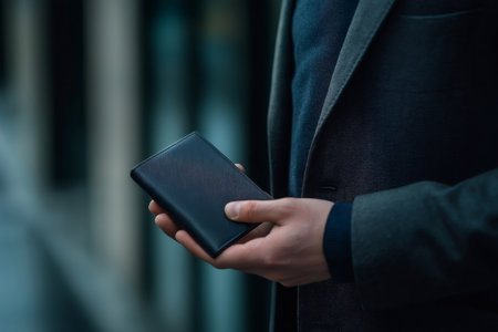 Close up of businessman holding elegant black leather wallet in his hands, concept of finance and business