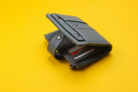 Open leather wallet with credit cards on a yellow background