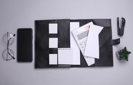 Black Leather organizer folder for paper with white business cards, notebook, calculator, smartpgone on gray background. Flat lay