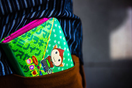 Black leather wallet with colorful stickers on the white table background with copy space.