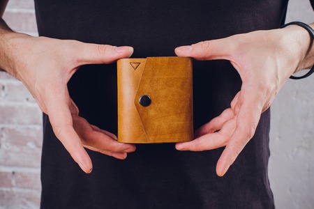 Open hand made leather man wallet on concrete background