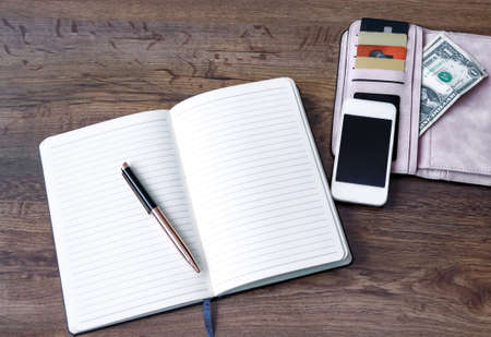 top view of notepad with pen, wallet with money and discount cards, phone, on wooden background