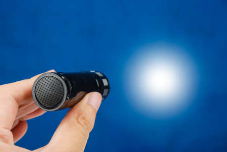 Pocket led flashlight in hand. illuminates blue background. Copy space