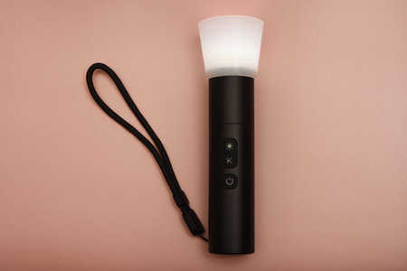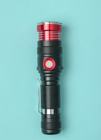 Blue light with beam top view photo on white background. Isolated pocket lightning equipment for camp or night walk. Trekking handle light. Led lamp with electric battery. Search or visibility concept