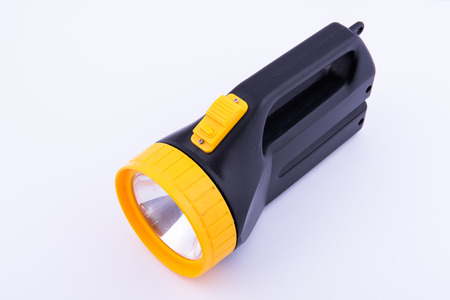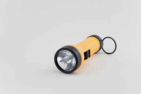 A vertical shot of a small black-silver flashlight isolated on a yellow background