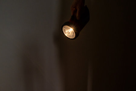 flashlight of mobile phone spreading light to electric switch on home wall while power outage in dark night