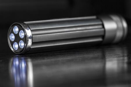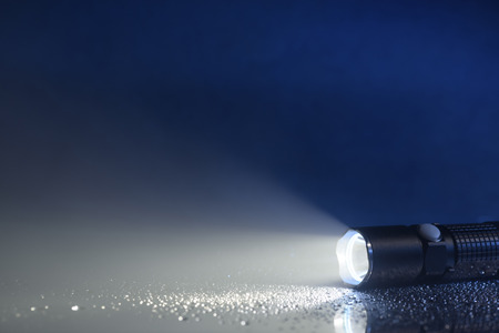 Tactical waterproof flashlight. LED flashlight shines on the table in smoke..