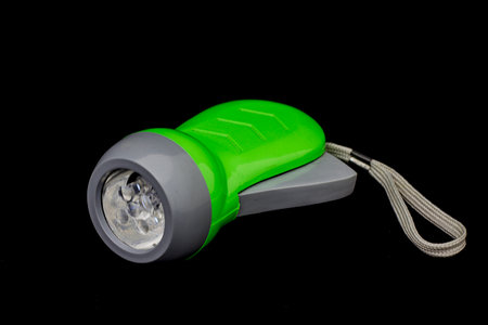 Hand pressing LED flashlight red plastic holder with hand rope isolated