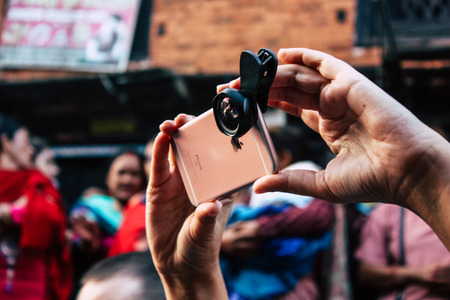 Bandipur Nepal October 18, 2018 Closeup of unknown people taking photo during a religious ceremony in Main street of Bandipur in the evening