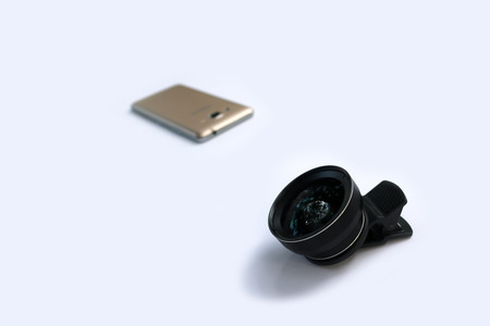Clip lens for connect with mobile phones in white background.