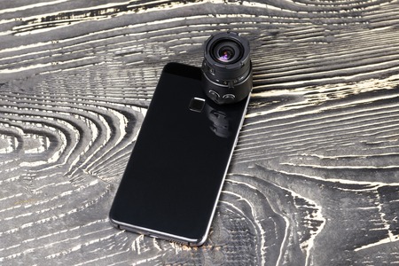 dark wooden background. The phone has a lens on it for macro shooting. close-up.