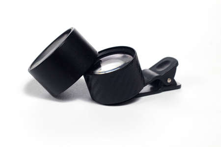 Phone photo lens with clips on white background. Extra macro camera for smartphone