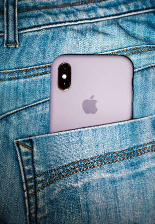 Paris, France - Sep 29, 2018: Rear view of denim jeans rear pocket with new Apple Computers Smartphone iPhone featuring double camera - gold colored phone