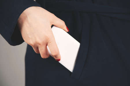 Close Up woman hand grabbing a white card in jeans pocket on dark background, smart card concept, mock up