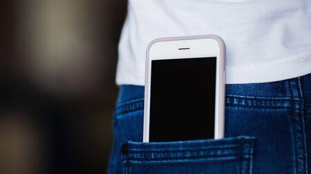 White screen smartphone in jeans pocket. Smartphone place for text. Smartphone in a pocket on a black background. Copy Space