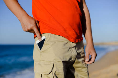 Tourist man using mobile phone on summer sand beach and sea outdoor background. Closeup of modern lifestyle holiday traveling season.