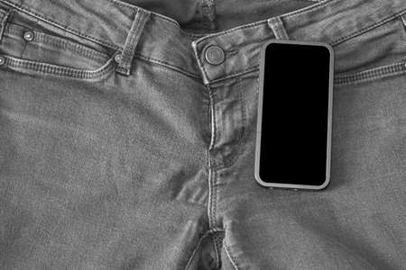 The upper part of old worn black jeans with pockets and a smartphone with a black screen, front view, mockup, monochrome