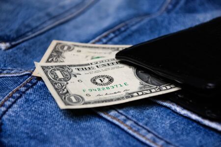 American dollars sticking out of the blue jeans pocket