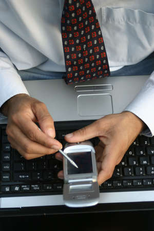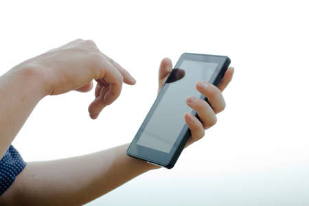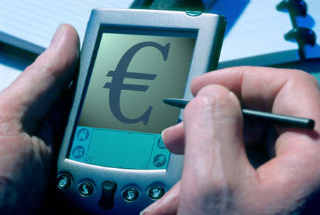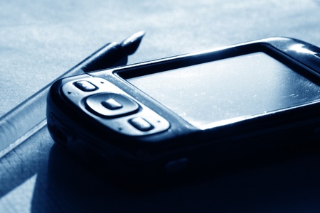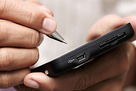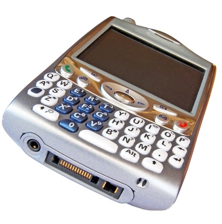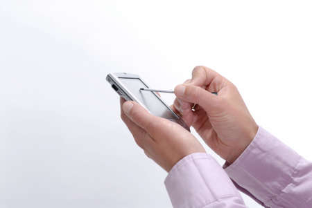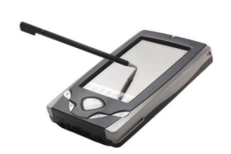 Not so up-to-date PDA with stylus touched to screen isolated over white