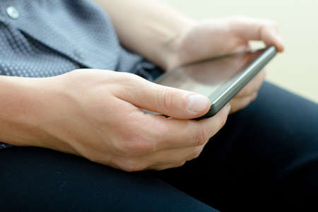 A man's hands with a mobile phone showing a seascape on a blurred background