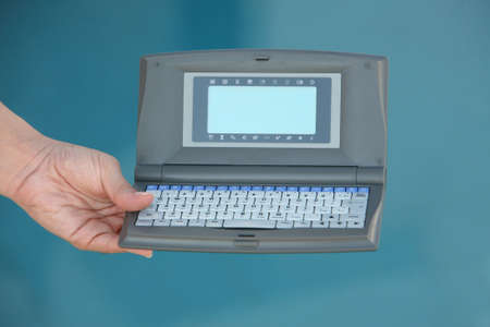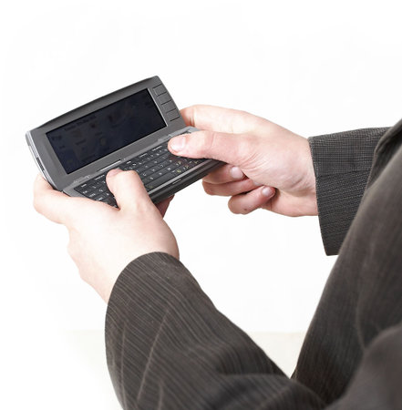 Pocket computer in a hand. With the schedule on the screen on a white background