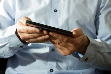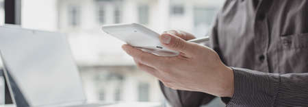 Close up image of smart phone mockup, businessman holding phone with white screen template