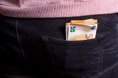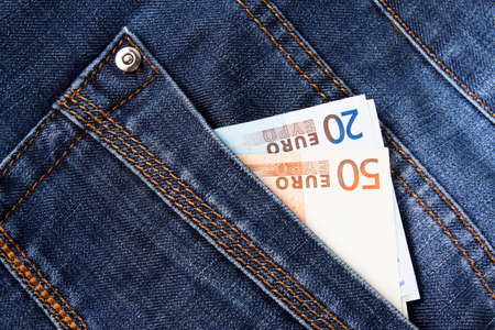 Euro banknotes in jeans back pocket. Concept of rich people, saving or spending money, close-up