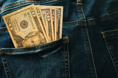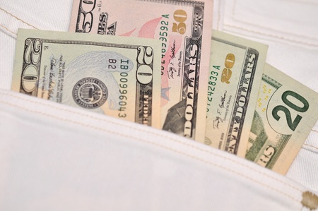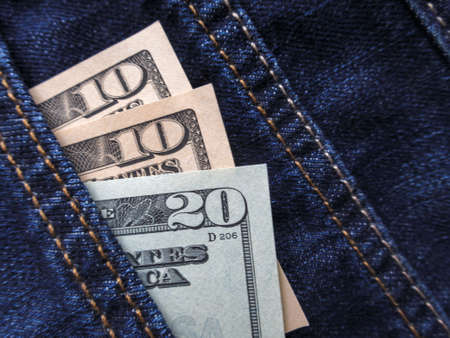 Background dollars sticking out of the back pocket of jeans shot closeup.