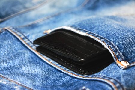 Purse or wallet in the back pocket of blue jeans.Close up.