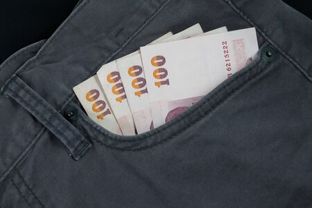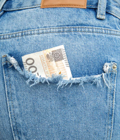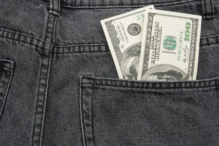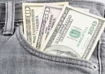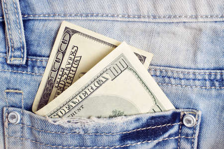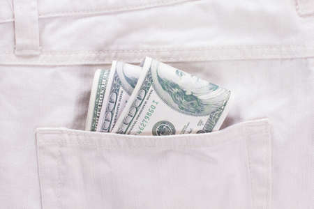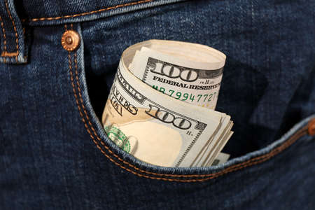 Cash in your pocket. A hundred dollar bills stuck out of the back pocket of blue jeans. Money saving concept