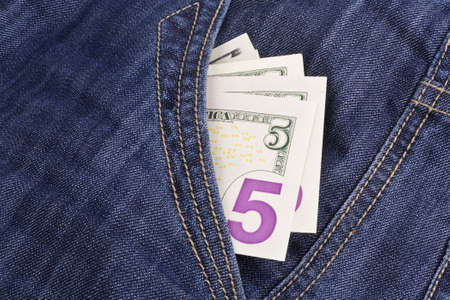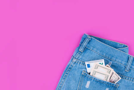 American hundred dollars and 100 euros in the back pocket of frayed jeans. Choice in currency exchange. Selective focus.