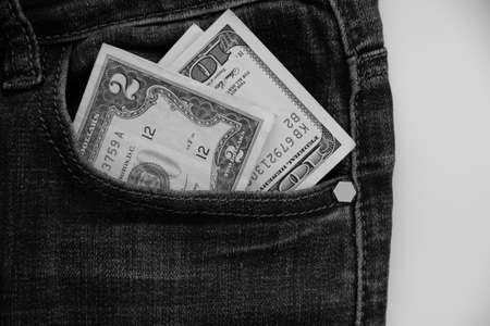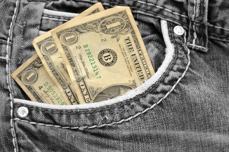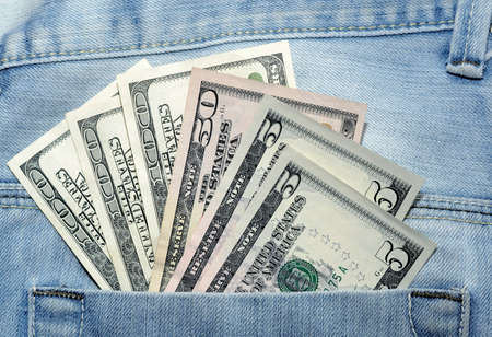 Dollar bill in the back pocket of blue jeans. Cash in your pocket