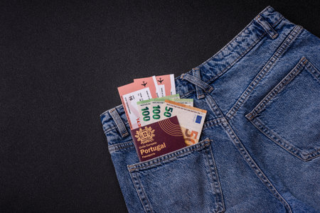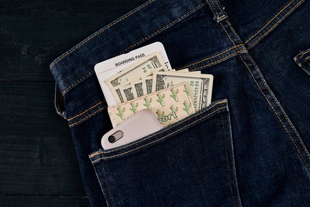 Passport in the back jeans pocket with American dollars. concept of travel. pocket money in my back pocket. out of pocket expenses. hundred dollars