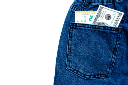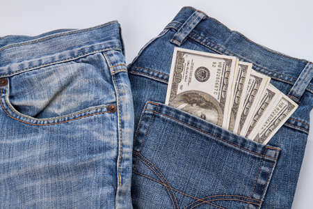 Pairs of jeans with dollars in the pocket. Isolated on white background.
