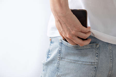White screen smartphone in jeans pocket. Smartphone place for text. Smartphone in a pocket on a white background. Copy Space