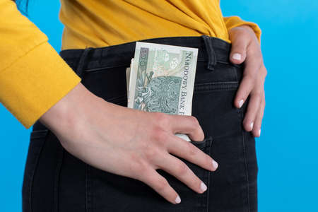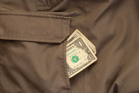 Money in a pocket of trousers or a skirt on a white background. Copy space. The concept of buying for dollars.