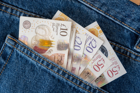 Jeans with British pound money. United Kingdom bills in the pants pocket for commerce concept.